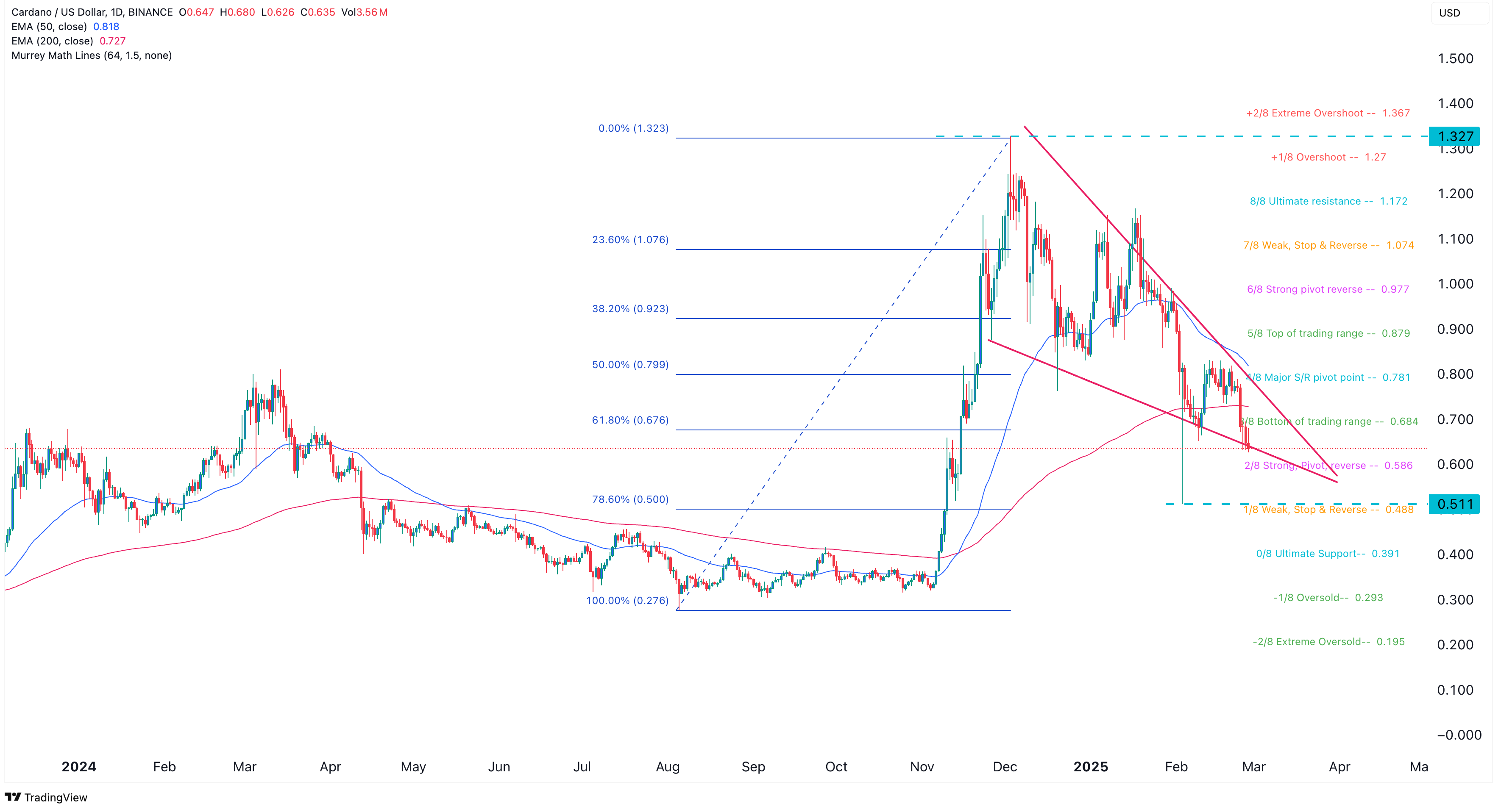 Der Cardano Kurs ist in den vergangenen Monaten stark gefallen und bewegte sich von 1,327 US-Dollar im November auf 0,635 US-Dollar. Er fiel unter das 61,8% Fibonacci-Retracement-Level sowie die 50-tägige und die 200-tägige EMA Linien. Auch das untere Ende der Handelsspanne der Murrey-Math-Linien wurde durchbrochen.