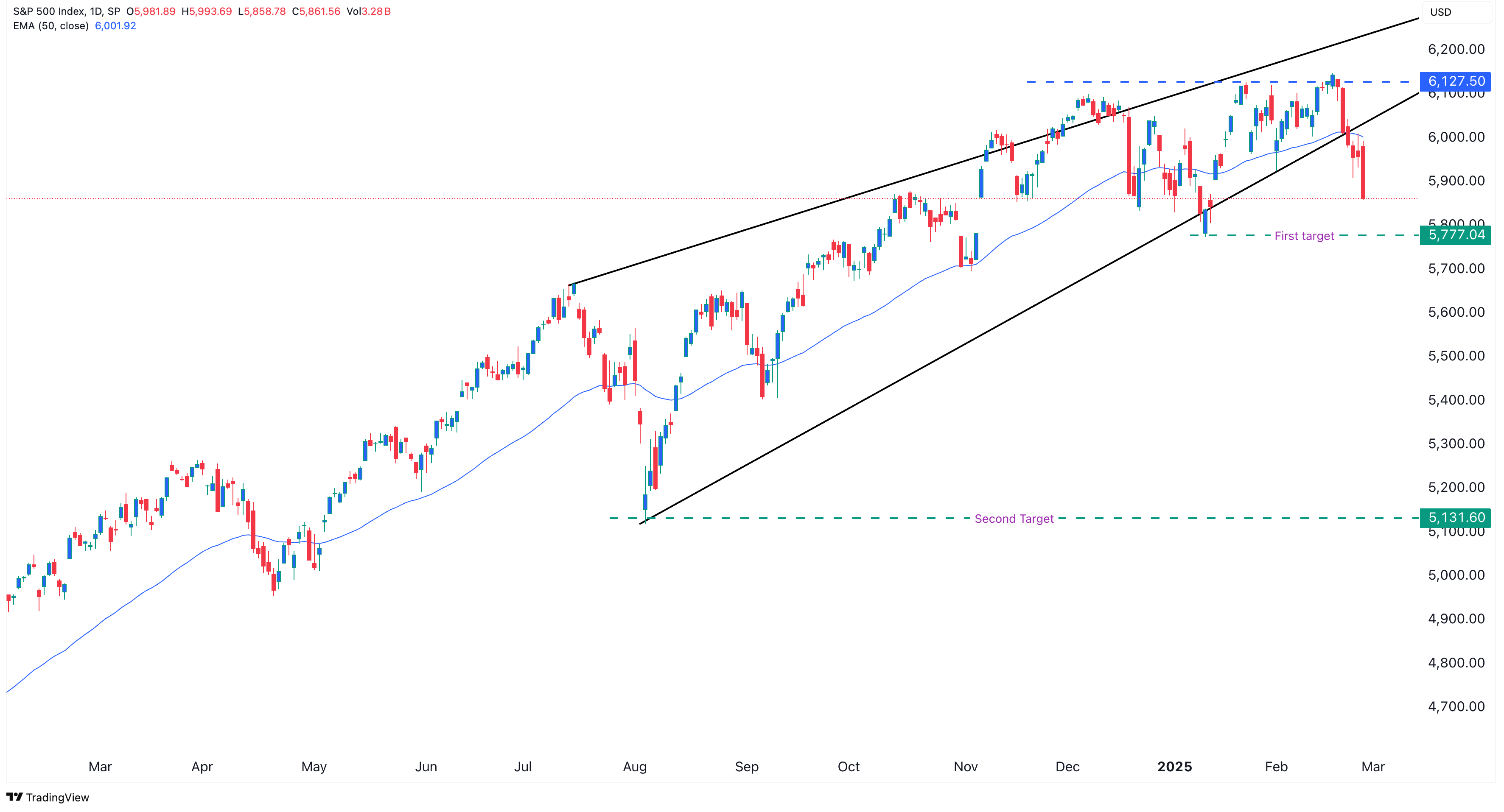 In der Regel führt ein solcher Keil zu einem starken Bärenabbruch, der ihn in diesem Fall auf die nächste Unterstützung bei 5.777 US-Dollar drücken könnte, dem niedrigsten Stand vom 13. Januar. Ein Unterschreiten dieser Unterstützung wäre richtungsweisend für einen weiteren Rückgang auf 5.500 US-Dollar. Im schlimmsten Fall könnte der Index auf 5.131 US-Dollar fallen, dem Tiefstand vom August 2024.
