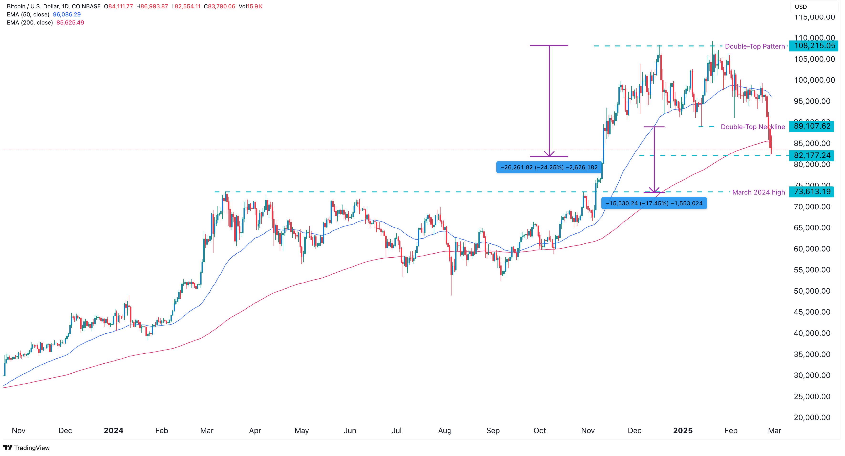 Inzwischen befindet sich der BTC Kurs unter 80.000 US-Dollar und damit unterhalb aller EMA Linien. Das ist ein weiteres Zeichen dafür, dass die Bären die Kontrolle haben. Dementsprechend zeigt die wahrscheinlichste Bitcoin Prognose auf einen bärischen Trend mit dem nächsten wichtigen Unterstützungsniveau bei 73.615 US-Dollar, dem höchsten Stand im März 2024.