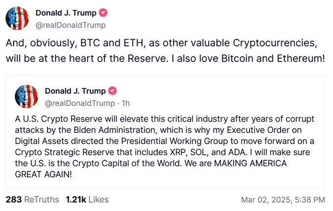 Am 2. März schnellte BTC in die Höhe, nachdem Präsident Trump eine strategische Krypto-Reserve angekündigt hatte. Zunächst gab es kaum Reaktionen, da Trump zunächst XRP, ADA und SOL erwähnte. Mehr als eine Stunde später bestätigte er Bitcoin, Ethereum und andere wertvolle Kryptowährungen, was die Rallye von BTC ankurbelte.