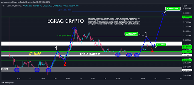 Egrag Crypto hat sich schon immer positiv zu VET geäußert. Im Februar 2024 sagte er voraus, dass VET um das 140-fache steigen würde, sobald er die Bewegung von 2021 erfolgreich widerspiegelt. In der Zwischenzeit wies er auch darauf hin, dass das 1-Dollar-Ziel realistischer sein könnte, sobald sich der Zyklus von 2020 wiederholt. Wie CNF berichtete, stieg der Kurs von VET damals um 6.538 % und legte um 0,1988 $ zu.