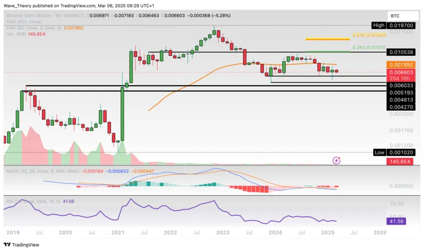 Gegen Bitcoin geht es für den BNB Kurs seit Mitte 2022 bergab. Damit stößt BNB zwischen rund 0,0052 BTC und 0,006 BTC auf signifikante Unterstützung.