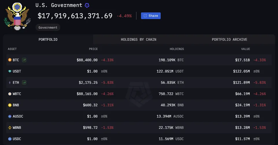Arkham Intelligence-Daten zeigen, dass die US-Regierung 198.109 BTC in ihren öffentlichen Wallets hält, die bei aktuellen Marktpreisen 17,5 Milliarden USD wert sind.