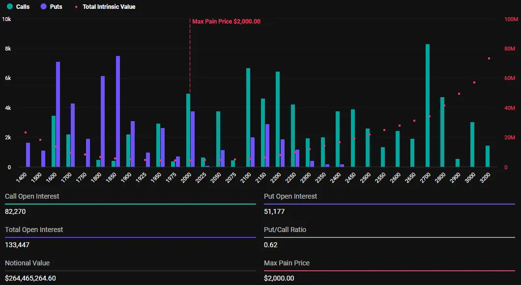 Ethereum hat 264,46 Millionen USD in ausstehenden Krypto-Optionen, die 133.447 Kontrakte umfassen. Diese Zahl ist ebenfalls niedriger als die 223.395 Kontrakte der Vorwoche. Der maximale Strike für diese Optionen liegt bei 2.000 USD und das Put-Call-Verhältnis beträgt 0,62.