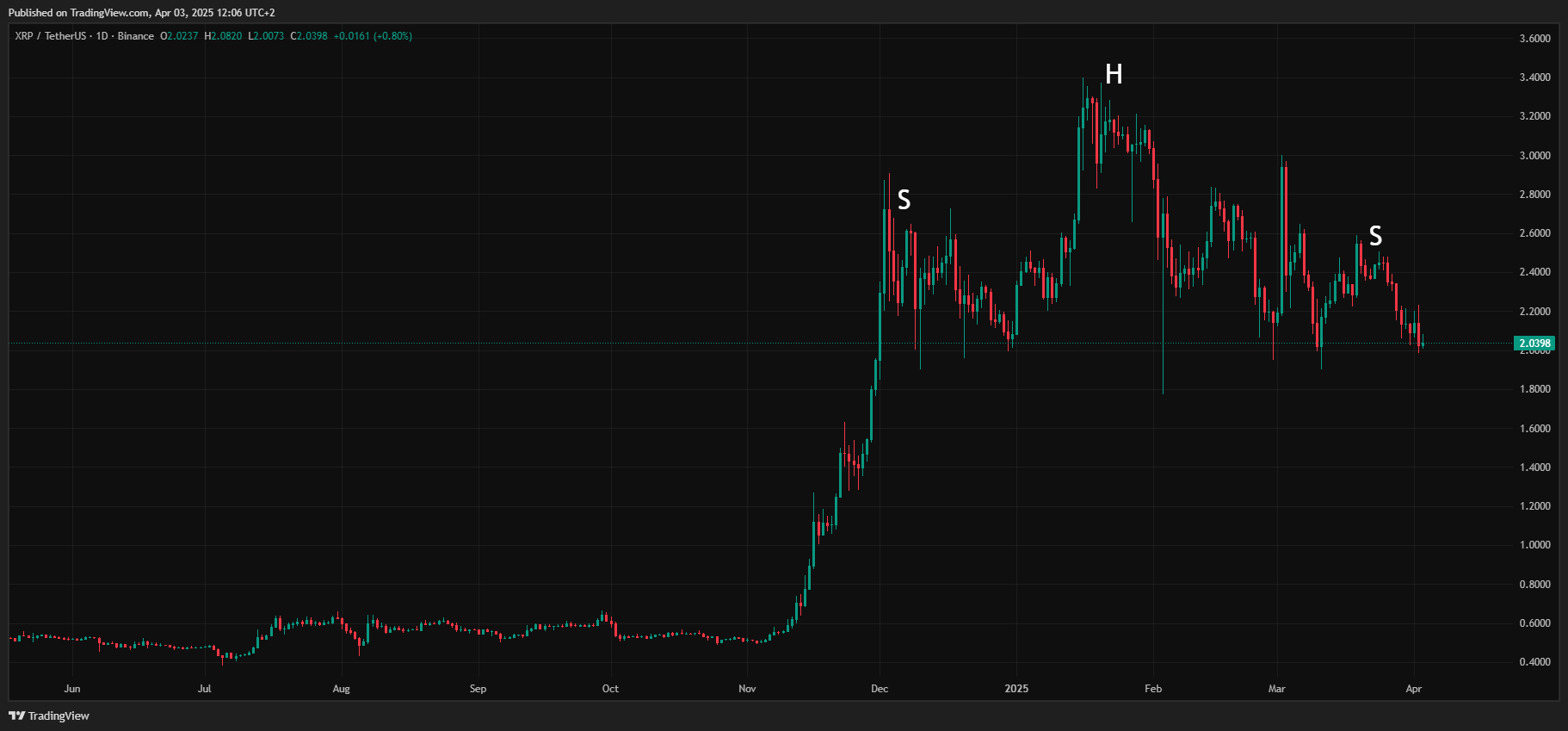 Im Preisdiagramm von XRP zeichnet sich ein sogenanntes Head-and-Shoulders-Muster ab – ein klassisches Signal aus der technischen Analyse, das oft eine Trendwende ankündigt. Das Muster besteht aus drei Spitzen, wobei die mittlere („der Kopf“) den höchsten Punkt bildet. Fällt der Kurs unter die Marke von 2 $, könnte dies als Bestätigung für einen beginnenden Abwärtstrend gewertet werden.