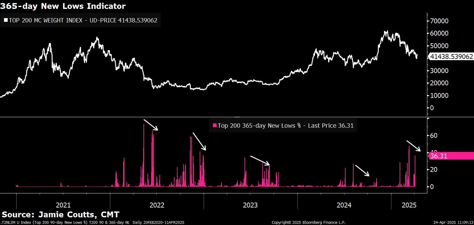 Im April 2025, obwohl die Marktkapitalisierung von Altcoins auf ein neues Tief fiel, sank die Anzahl der Altcoins, die neue 365-Tage-Tiefststände erreichten, erheblich. Historisch gesehen geht dieses Muster oft einer Erholung der Altcoin-Marktkapitalisierungen voraus.