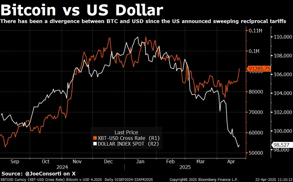 Joe Consorti, Head of Growth bei TheyaBitcoin, bemerkte, dass Bitcoin begann, sich vom US-Dollar zu entkoppeln, nachdem die Ankündigung des umfassenden Zollregimes erfolgt war. Ein Diagramm aus seinem Beitrag zeigt, dass im April, während der DXY stark von 103,5 auf 98,5 fiel, Bitcoin von etwa 75.000 USD auf über 91.000 USD stieg.