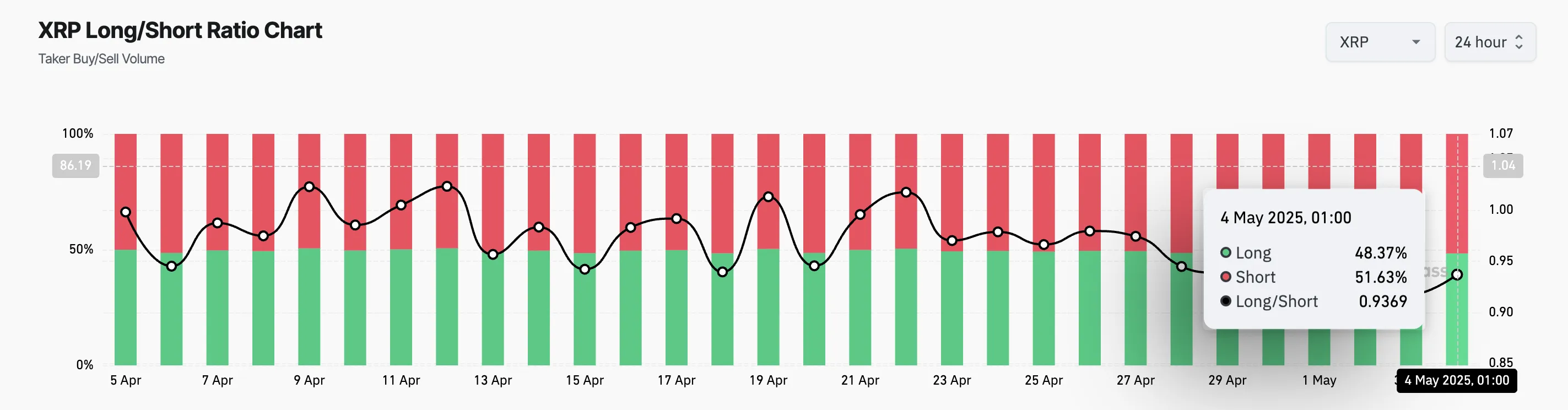 Umgekehrt, wie bei XRP, wenn das Verhältnis unter eins liegt, wetten Trader auf einen Kursrückgang. Das Long/Short-Verhältnis, das seit einigen Tagen unter 1 bleibt, unterstreicht eine vorherrschende bärische Stimmung auf dem XRP-Markt und signalisiert Erwartungen eines weiteren Rückgangs.