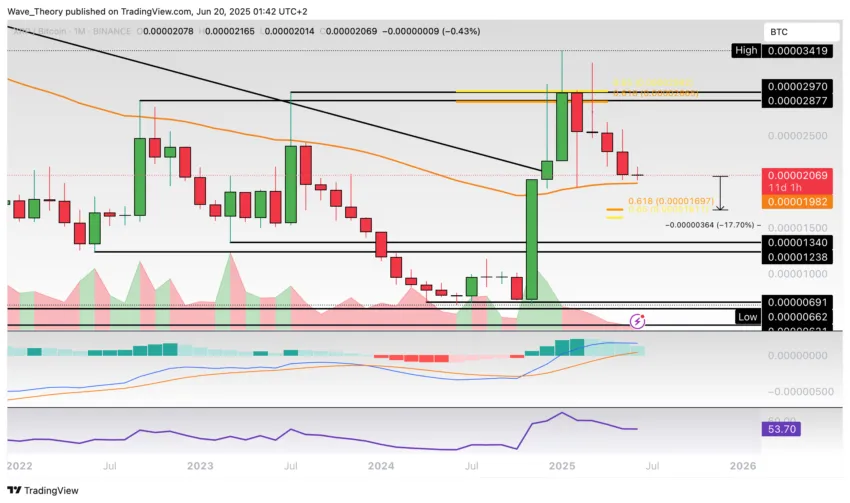 Gegen Bitcoin geht es für Ripple seit fünf Monaten bergab. Dabei stößt er jetzt am 50-Monate-EMA bei rund 0,00001982 BTC auf signifikante Unterstützung.