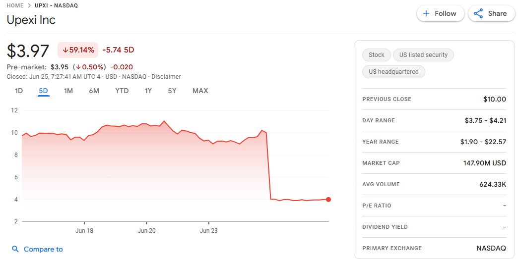 Die Aktien von Upexi Inc. fielen am 24. Juni 2025 um über 60%, nachdem das Unternehmen bei der SEC eine Registrierung für den Weiterverkauf eingereicht hatte. Die Anmeldung erlaubte es Investoren, alle Aktien aus der Krypto-Treasury-Erhöhung des Unternehmens vom April zu verkaufen.