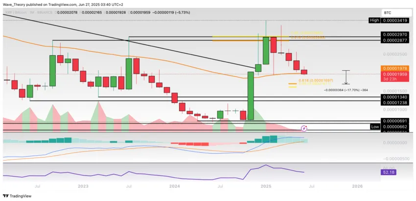 Gegen Bitcoin stößt Ripple jetzt auf signifikante Unterstützung am 50-Monate-EMA bei rund 0,0000198 BTC. Sollte Ripple diese Unterstützung bärisch brechen, wartet bei rund 0,000017 BTC die nächste signifikante Fib Unterstützung.