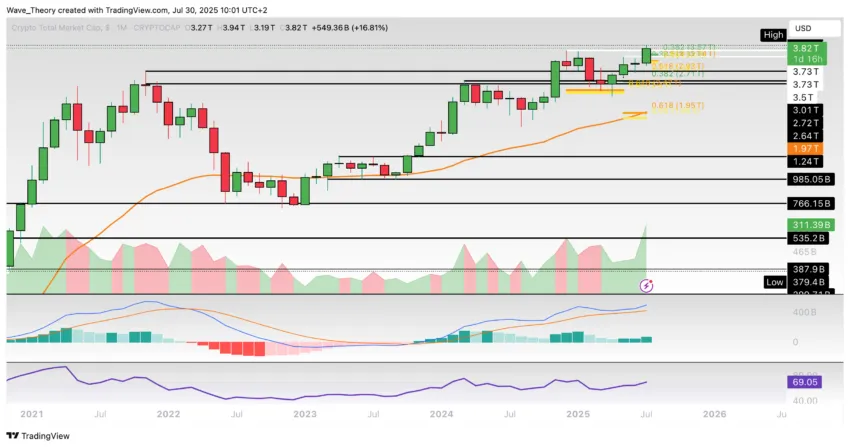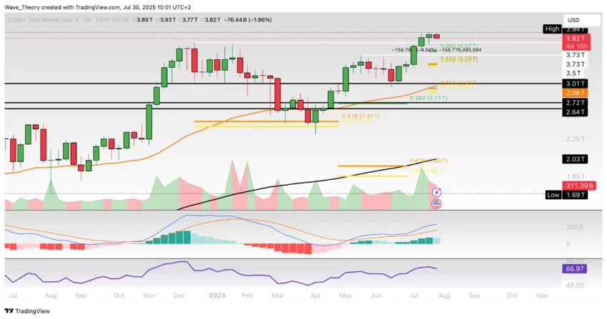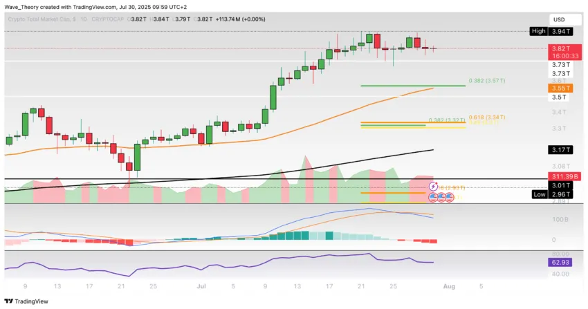 Der Krypto-Markt könnte jetzt zum 50-Tage-EMA bei rund 3,55 Billionen USD korrigieren