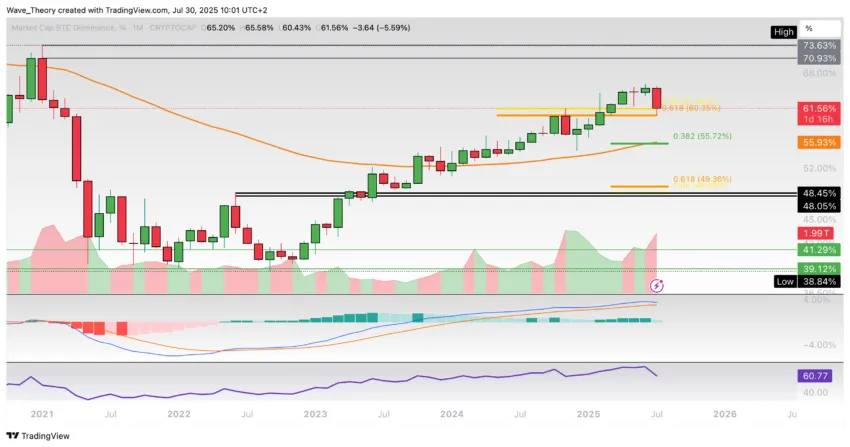 Sollte die Bitcoin Dominanz die Golden Ratio Unterstützung bei rund 60,5 % bärisch brechen, warten bei rund 56,7 % und 49 % die nächsten signifikanten Fibonacci Unterstützungen.