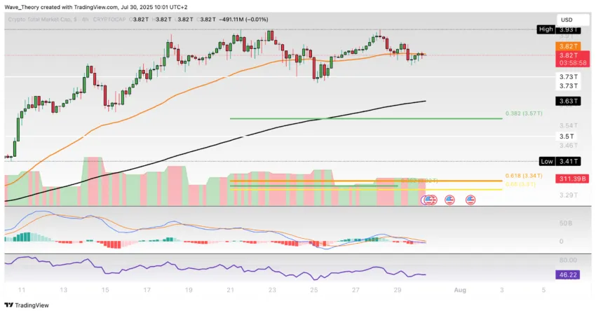 Der Markt könnte jetzt zum 0,382 Fib Niveau am 50-Tage-EMA bei rund 3,55 Billionen USD korrigieren. Dort angekommen, könnte der Markt bullisch abprallen.