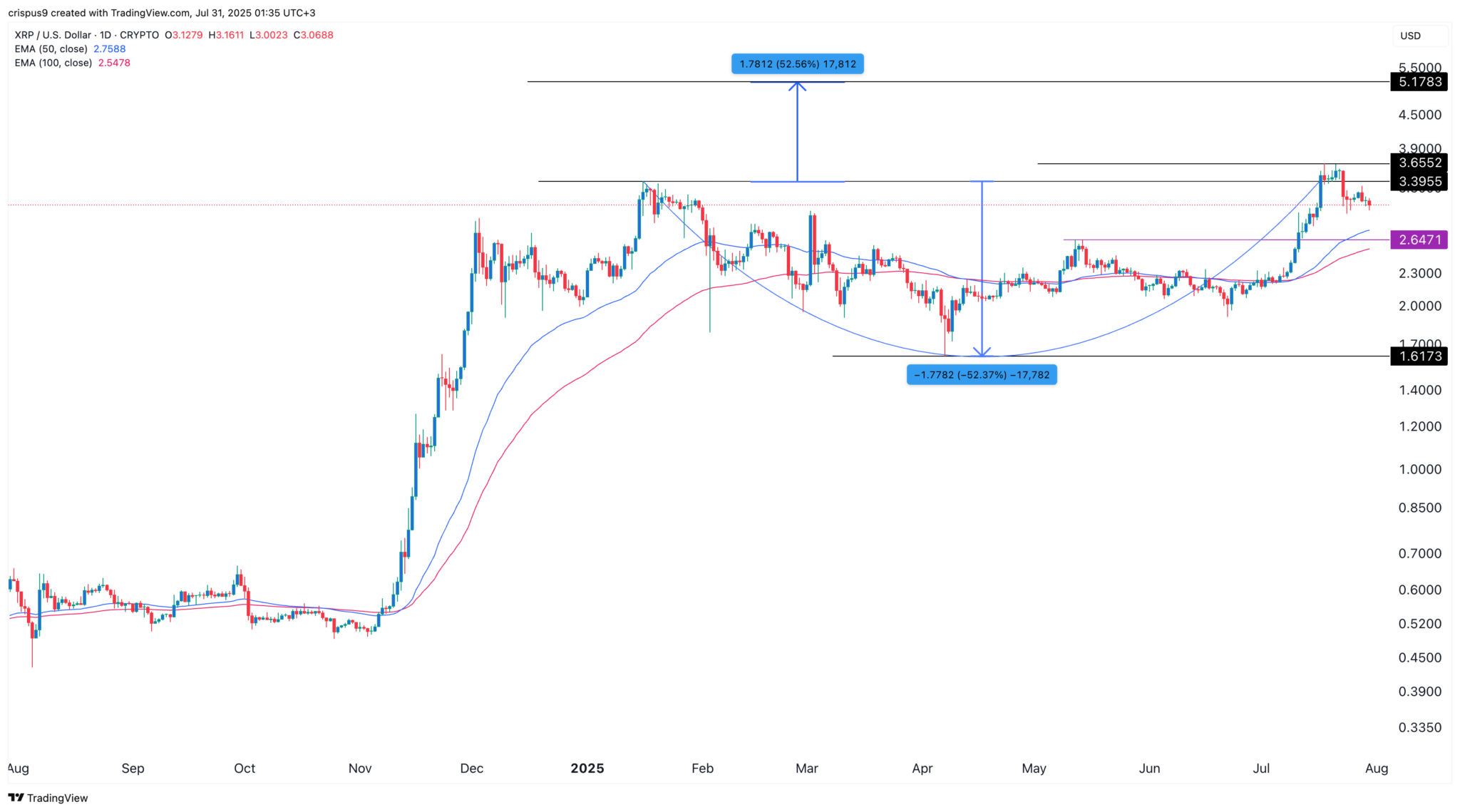 Der Coin bildet jetzt den Henkelabschnitt aus, was erklärt, warum er in den letzten Tagen zurückgegangen ist. XRP liegt weiterhin über dem gleitenden 50- und 100-Tage-Durchschnitt, was die bullische These unterstützt.