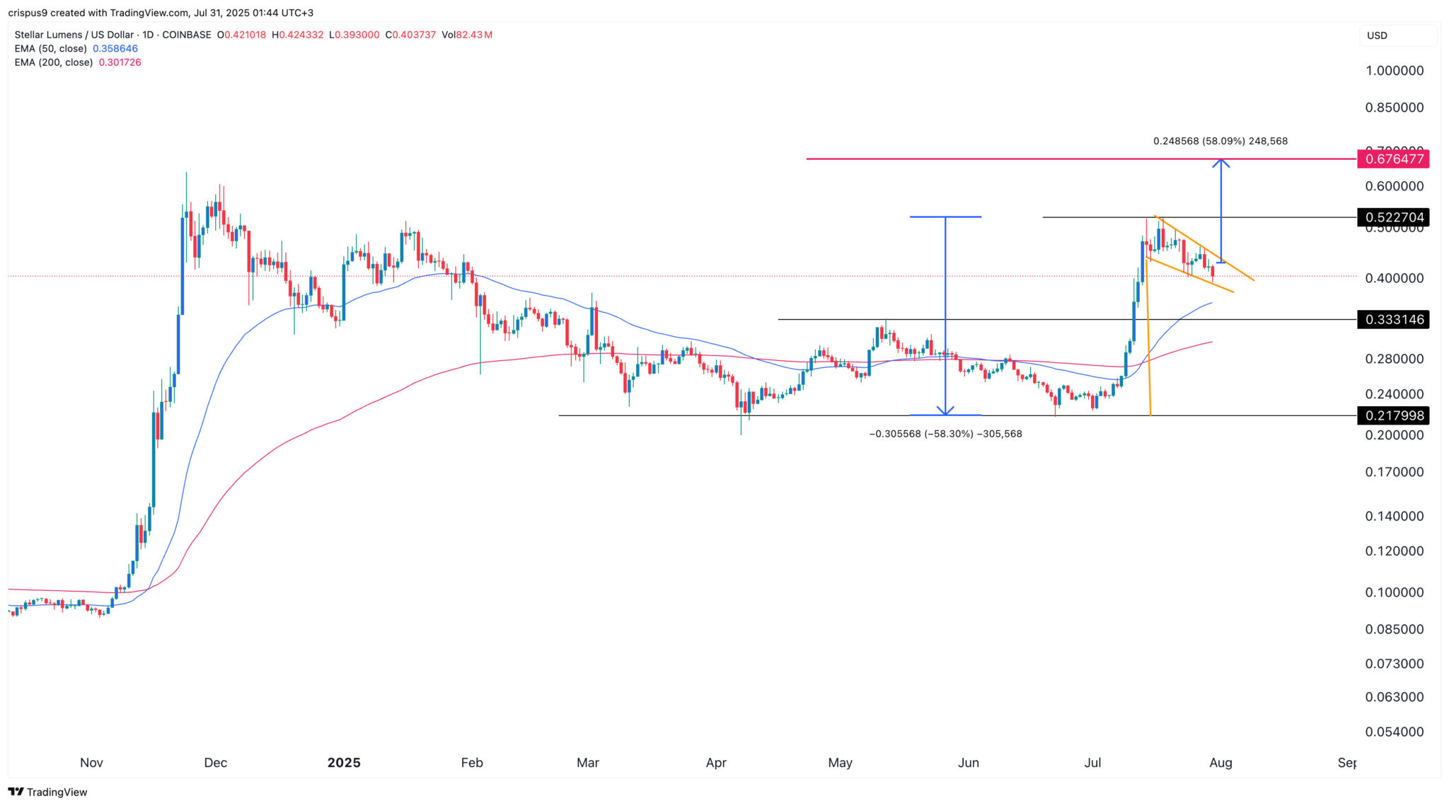 Der Stellar Lumens-Kurs bildet jetzt ein bullisches Flaggenmuster, das aus einer vertikalen Linie, die einer Fahnenstange ähnelt, und einem flaggenähnlichen Muster besteht. Daher deutet die Kombination dieser Muster auf ein mögliches Comeback im August hin.