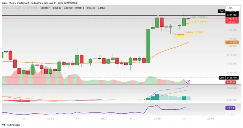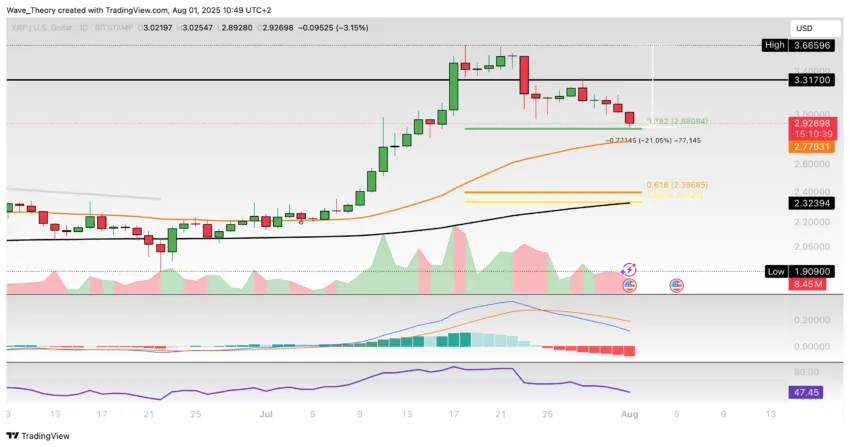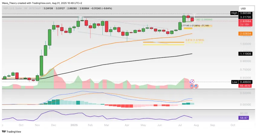 Ripple-Prognose für Freitag, 01. August 2025: Der XRP Kurs ist jetzt rund 21 % gefallen und erreicht damit signifikante Fib Unterstützung. Prallt der Kurs jetzt bullisch ab?