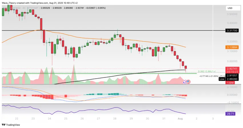 Währenddessen erreicht der RSI allmählich überverkaufte Regionen, gibt dabei aber keine bullischen Signale. Darüber hinaus wird im 4H-Chart deutlich, dass der Kurs vor wenigen Tagen am 50-4H-EMA bei rund 3,14 USD bärisch abgewiesen wurde.