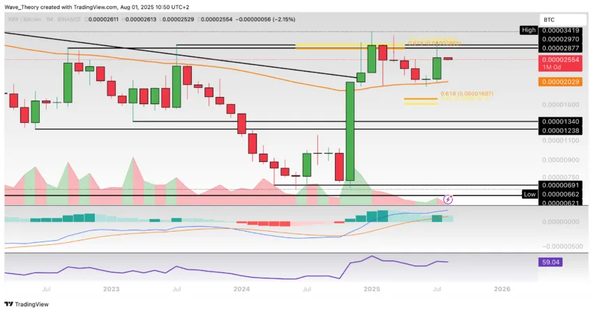 Gegen Bitcoin wurde Ripple am kritischen Golden Ratio Widerstand bei rund 0,000029 BTC bärisch abgewiesen. Damit könnte der XRP Kurs zur 50-Monate-EMA Unterstützung bei rund 0,00002029 BTC zurückkehren.