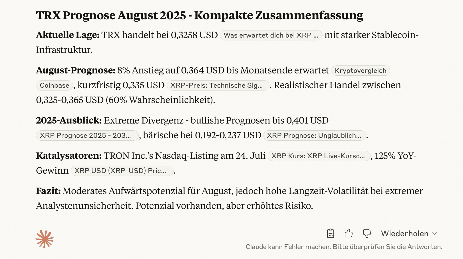 Die TRON-Prognose für August 2025, wie sie Claude AI darlegt, deutet derweil auf ein moderates Aufwärtspotenzial hin. Aktuell liegt TRX bei rund 0,326 US-Dollar, gestützt durch eine robuste Stablecoin-Infrastruktur.