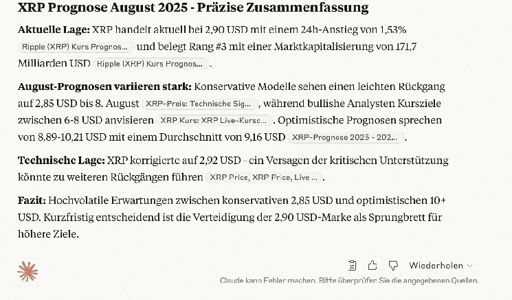 Die von Claude AI zusammengefasste XRP-Prognose für August 2025 zeigt ein extrem breites Spektrum möglicher Entwicklungen. Während konservative Modelle kurzfristig einen Rückgang bis 2,85 US-Dollar erwarten, sehen bullishe Szenarien mittelfristig Potenzial für eine Rallye in Richtung 6 bis 8 US-Dollar. Optimistische Einschätzungen gehen sogar von zweistelligen Kursmarken über 10 US-Dollar aus. Technisch gilt die Zone um 2,90 US-Dollar als entscheidende Unterstützung: Ein Bruch könnte neue Tiefs auslösen, ein stabiler Halt hingegen den Weg für höhere Ziele öffnen.