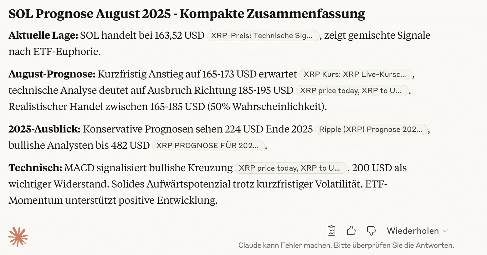 Die von Claude AI skizzierte Solana-Prognose für August 2025 zeigt derweil ein überwiegend positives, aber differenziertes Bild. Nach der jüngsten ETF-Euphorie pendelt SOL um 163 US-Dollar, wobei kurzfristig Kursziele zwischen 165 und 173 US-Dollar im Raum stehen. Technische Modelle sehen zudem Chancen auf einen Ausbruch in Richtung 185 bis 195 US-Dollar, während ein realistisches Szenario den Handel im Bereich 165 bis 185 US-Dollar ansiedelt.