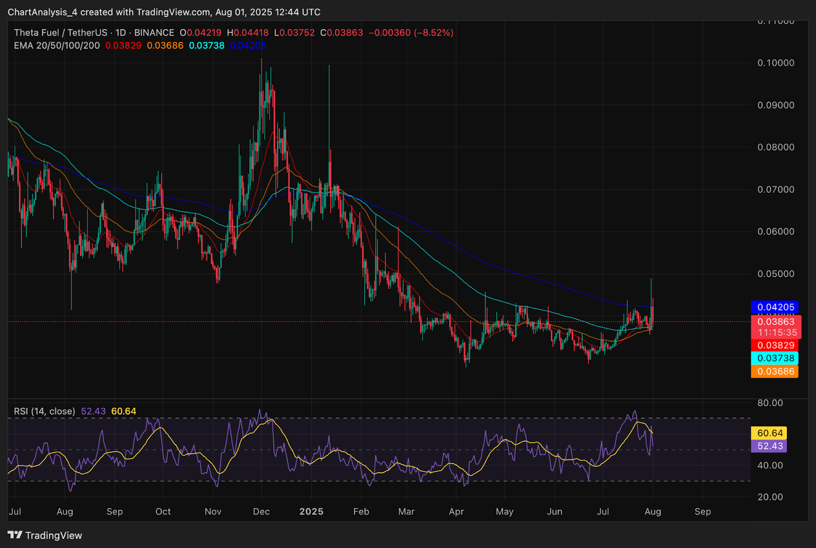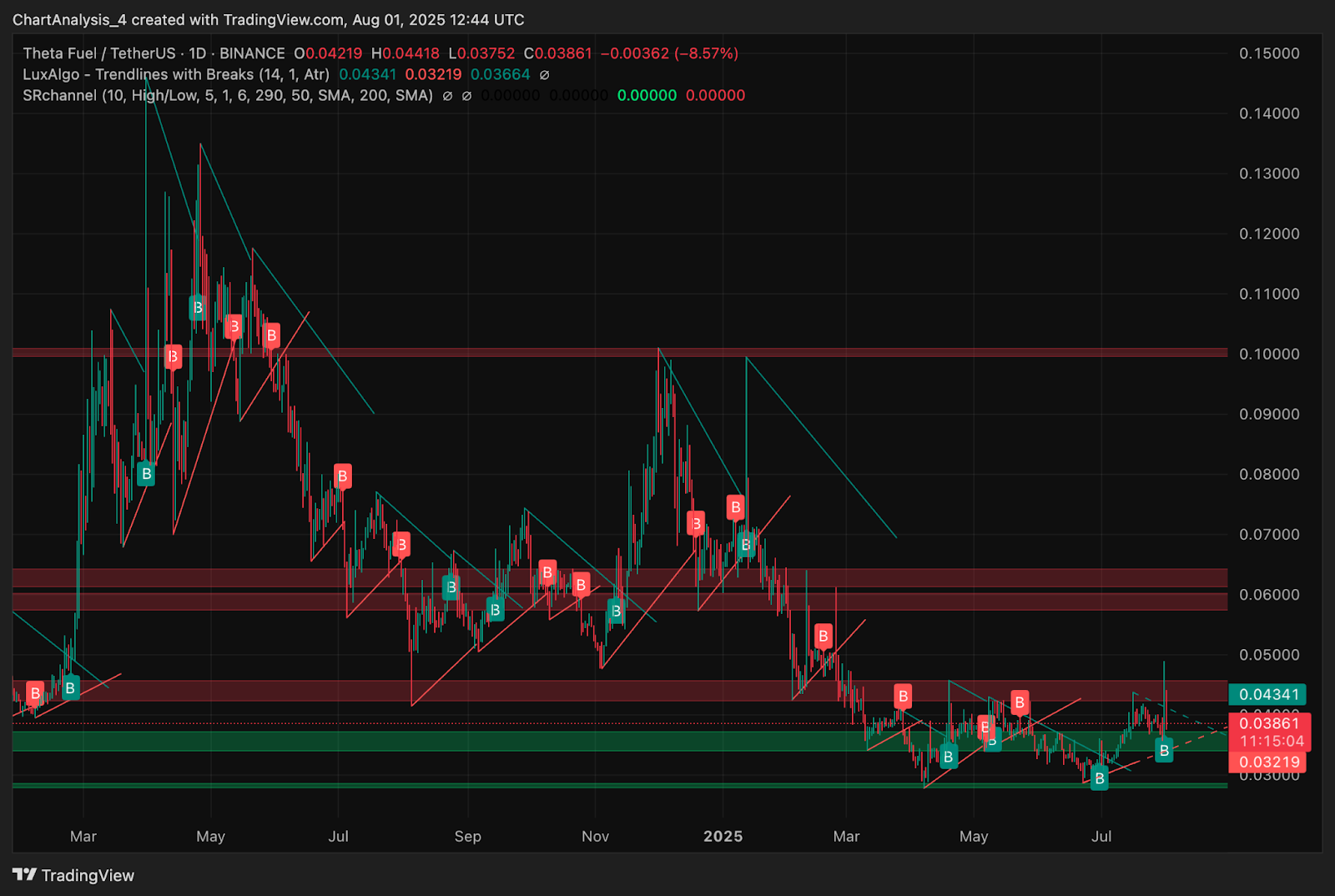 Der Ausbruchsversuch von TFUEL Ende Juli testete die historischen Angebotszonen, konnte aber keine Fortsetzung erzeugen, was die Notwendigkeit eines nachhaltigen Schlusskurses über 0,045 $ unterstreicht, um die mittelfristige Ausrichtung zu ändern. Bis dahin verharrt der Token in einem rangegebundenen Umfeld.