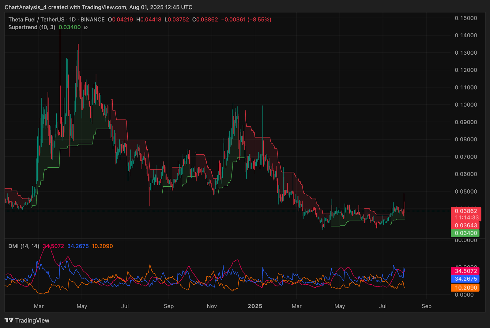 Der tägliche Supertrend drehte um 0,034 $ nach oben, und TFUEL handelt weiterhin über dieser Zone, was die Unterstützung für die jüngste Bewegung bestätigt. Der Directional Movement Index (DMI) zeigt, dass sowohl der +DI als auch der -DI konvergieren, wobei der ADX langsam über 10 steigt. Ein Anstieg über 20 Punkte beim ADX würde die Stärke des Trends bestätigen.