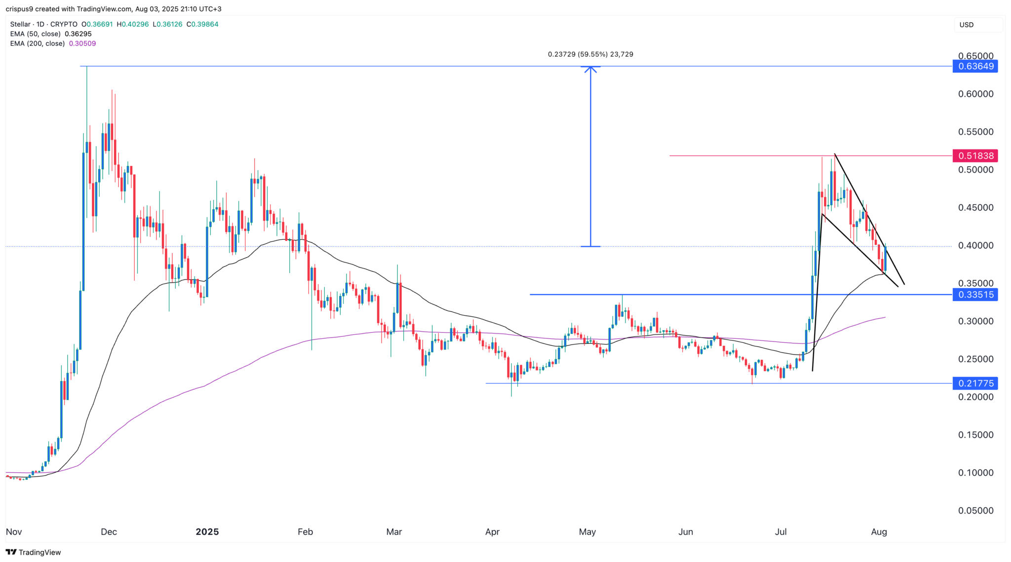Der Stellar-Kurs bildete auch ein goldenes Kreuzmuster, als sich die gleitenden Durchschnitte der 50- und 200-Tage-Linie am 15. Juli kreuzten. Ein goldenes Kreuz gilt in der technischen Analyse als eines der bullischsten Chartmuster.