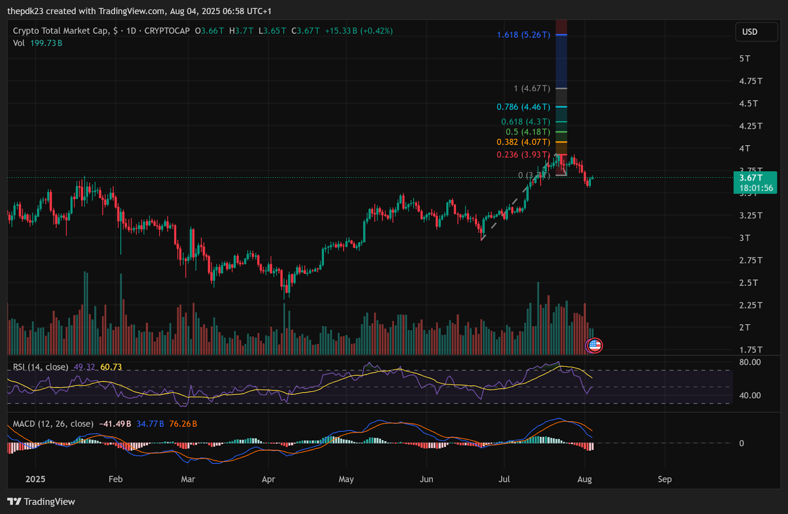 Die Ablehnung kam knapp unter dem 0,236 Fibonacci Retracement-Level (um 3,93 Billionen $), was darauf hindeutet, dass dies eine gesunde Korrektur in einem breiteren Aufwärtstrend sein könnte, wenn die Unterstützung über 3,4 Billionen $ hält.