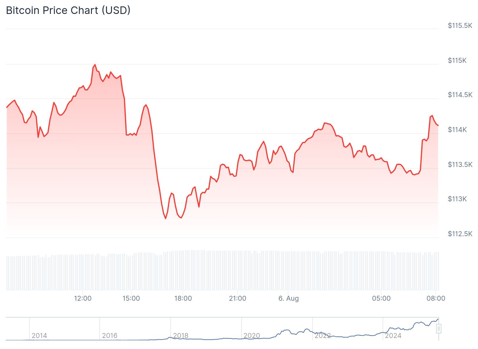 Bitcoin ist auf 112.700 Dollar gefallen, was noch etwas höher ist als der Tiefpunkt vom Samstag. Der niedrigste Punkt wurde am Ende des Nachmittags erreicht, danach ist der Kurs wieder etwas über 114.000 Dollar geklettert. Aber solange die 116.000 Dollar nicht durchbrochen werden, könnte es erneut auf 112.000 Dollar oder sogar 110.000 Dollar fallen.