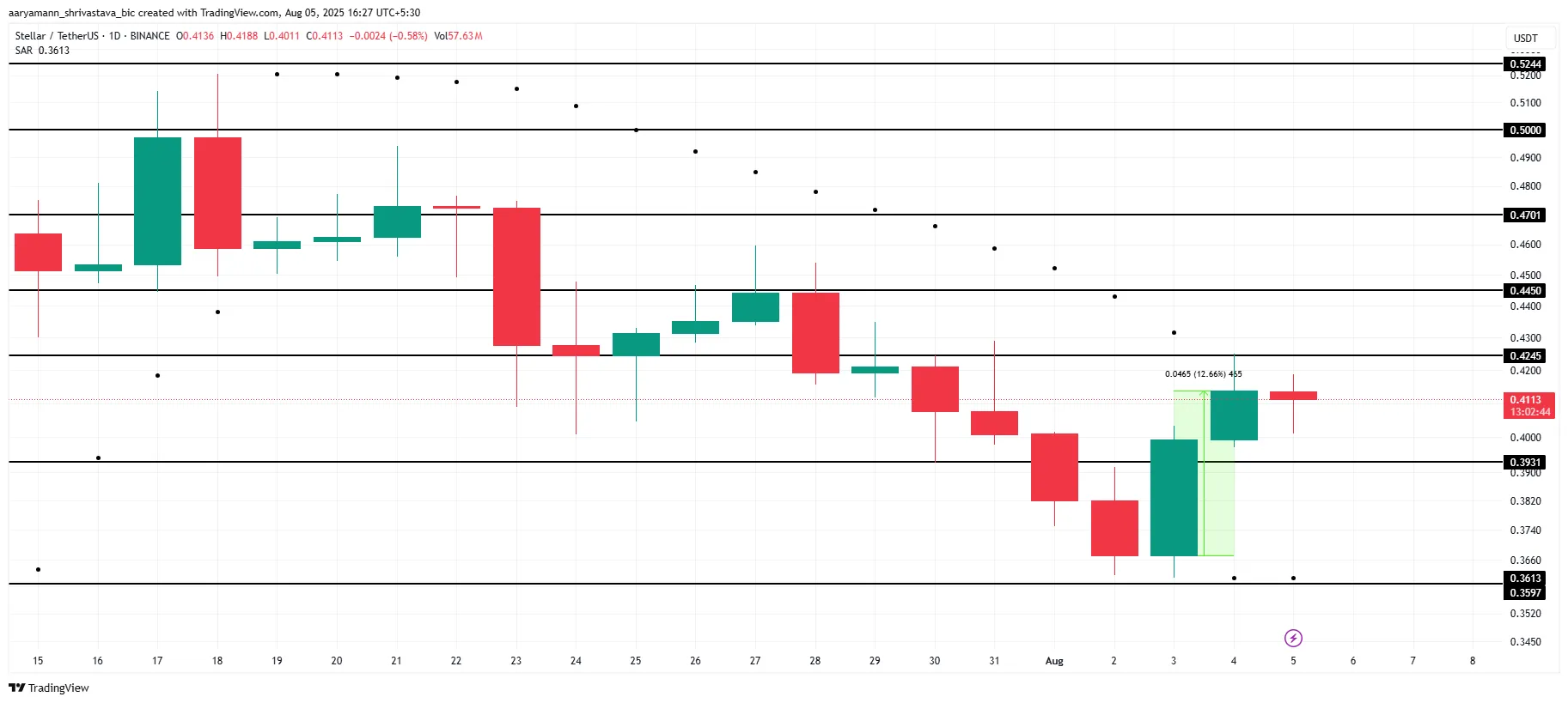 Der Kurs von Stellar liegt derzeit bei 0,411 USD, knapp unter dem Widerstandsniveau von 0,424 USD. Das Überwinden dieses Widerstands wird entscheidend sein, damit XLM die jüngsten Verluste ausgleichen und seinen Aufwärtstrend fortsetzen kann. Der Parabolic SAR, der sich nach zwei Wochen unter die Kerzen bewegt, signalisiert, dass der Abwärtstrend zu Ende geht.