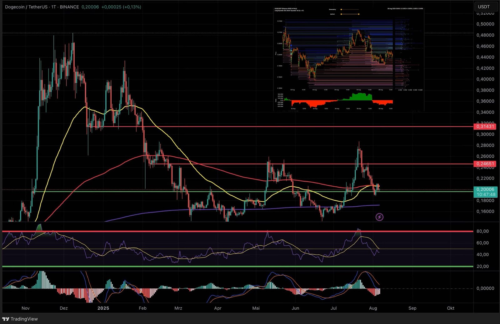 Im Tageschart stand Dogecoin (DOGE) kurz vor der vollständigen Aktivierung eines klassischen W-Patterns, ehe ein marktweiter Abverkauf, ausgelöst durch den Rücklauf von Bitcoin an den 50er EMA, den gesamten Altcoin-Sektor unter Druck setzte. Infolgedessen fiel DOGE zurück an die grüne Unterstützungszone im Bereich von 0,20 US-Dollar.
