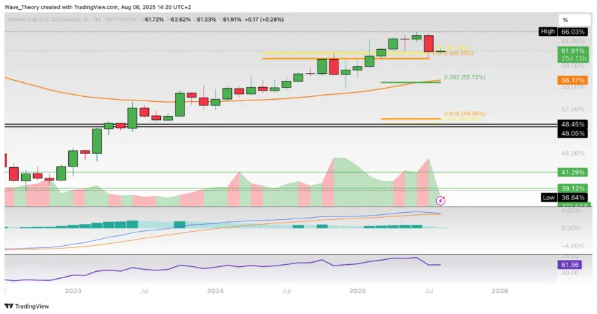 Sollte die Bitcoin Dominanz die Golden Ratio Unterstützung bei rund 60,5 % bärisch brechen, warten bei rund 56,7 % und 49 % die nächsten signifikanten Fibonacci Unterstützungen.