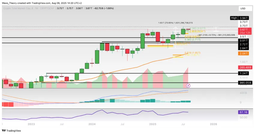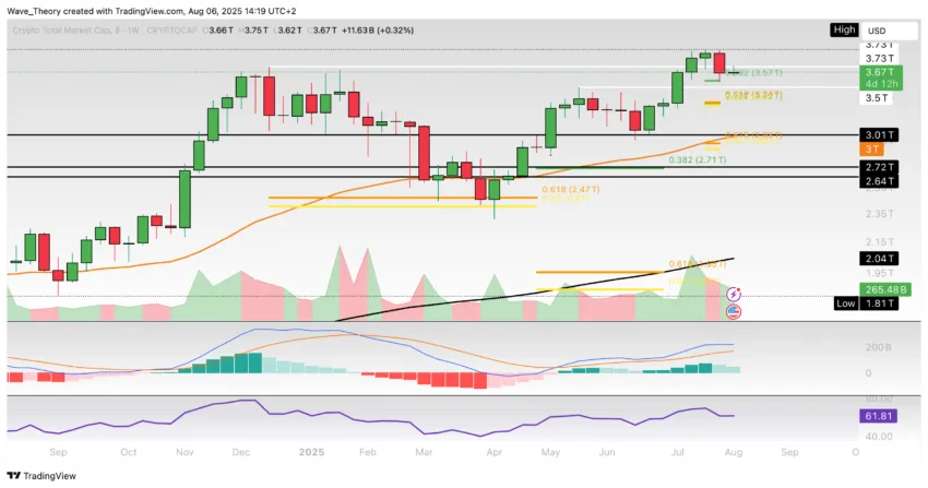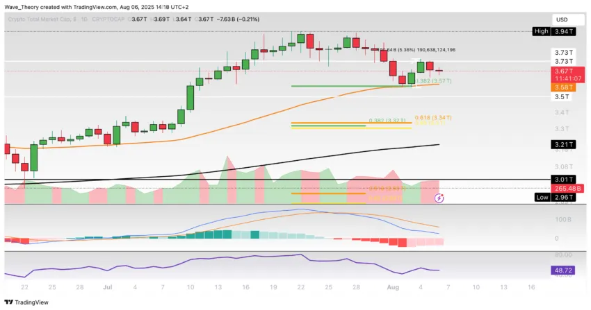 Der Markt hat eine Korrektur eingeleitet und ist von rund 3,94 Billionen USD auf rund 3,56 Billionen USD gefallen. Dabei konnte er am 50-Tage-EMA an der 0,382 Fib Unterstützung bei rund 3,58 Billionen USD bullisch abprallen.