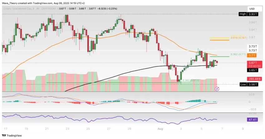 Zudem fungiert der 50-4H-EMA bei rund 3,7 Billionen USD als zusätzlicher Widerstand, woran der Kurs mehrfach bärisch abgewiesen wurde.
