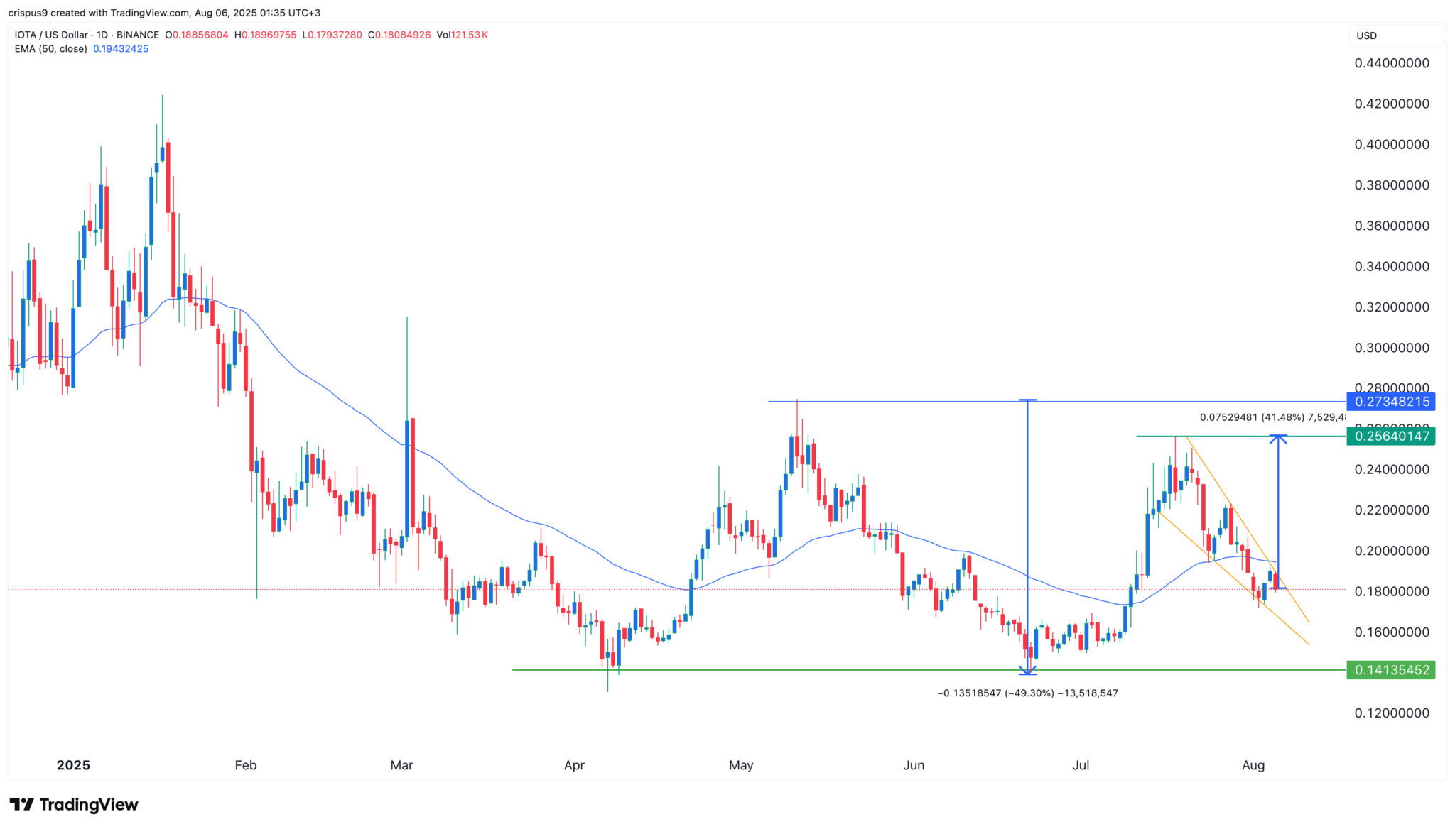 Der IOTA-Kurs hat sich jetzt leicht unter den gleitenden 50-Tage-Durchschnitt bewegt, was ein bärisches Zeichen ist. Auf der positiven Seite hat der Token ein fallendes Keilmuster gebildet, das entsteht, wenn zwei absteigende Trendlinien zusammenlaufen.
