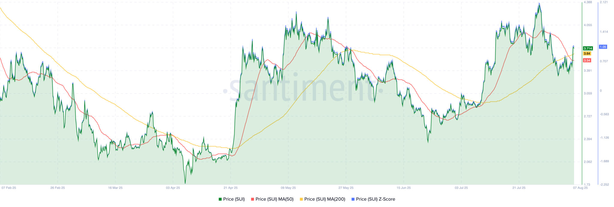 Auf Santiment sehen wir auch, dass der SUI-Coinpreis die 200MA zurückerobert und wieder über die 50MA ausbricht, ein zuverlässiges bullisches Signal nach dem Einbruch im Juli. Die Unterstützung liegt zwischen 3,45 $ und 3,50 $, was das Tagestief und die vorherige Preisspanne einschließt. Der Widerstand zieht sich bei 3,78 $ zusammen, dem Tageshöchststand der SUI-Coin.