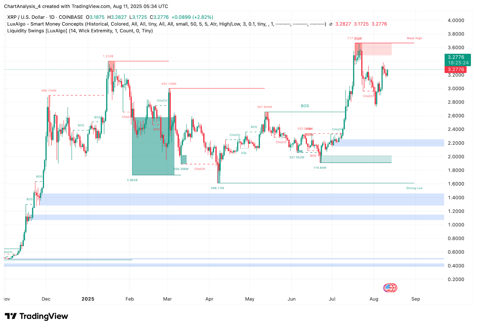 Der XRP-Preis liegt heute bei 3,277 $, nachdem er sich von dem Rückgang der letzten Woche vom Höchststand von 3,6656 $ stetig erholt hat. In der täglichen Ansicht von Smart Money Concepts wird 3,6656 $ als schwaches Hoch markiert, über dem die Liquidität geparkt ist. Der Kurs fand ein festes Gebot bei 3,0933 $, dem Punkt, an dem der 4-Stunden-Supertrend bullisch wurde, und er handelt weiterhin über der Nachfragezone von 3,09 $, die sich während des Ausbruchs im Juli gebildet hat.