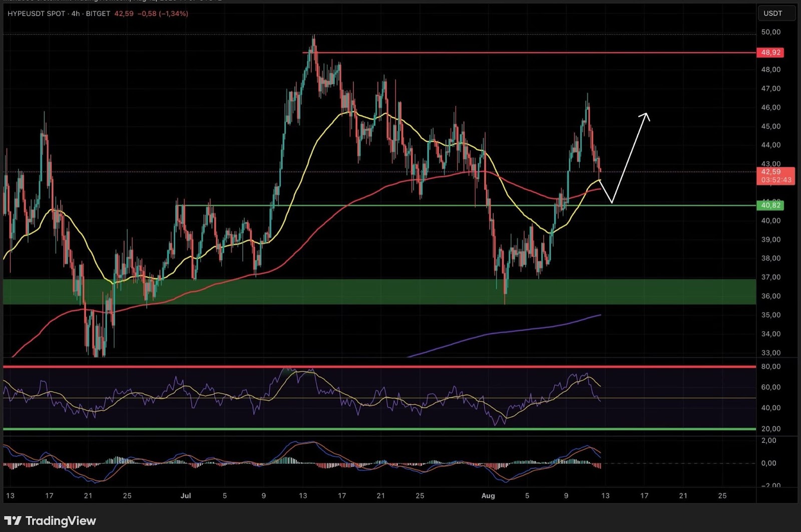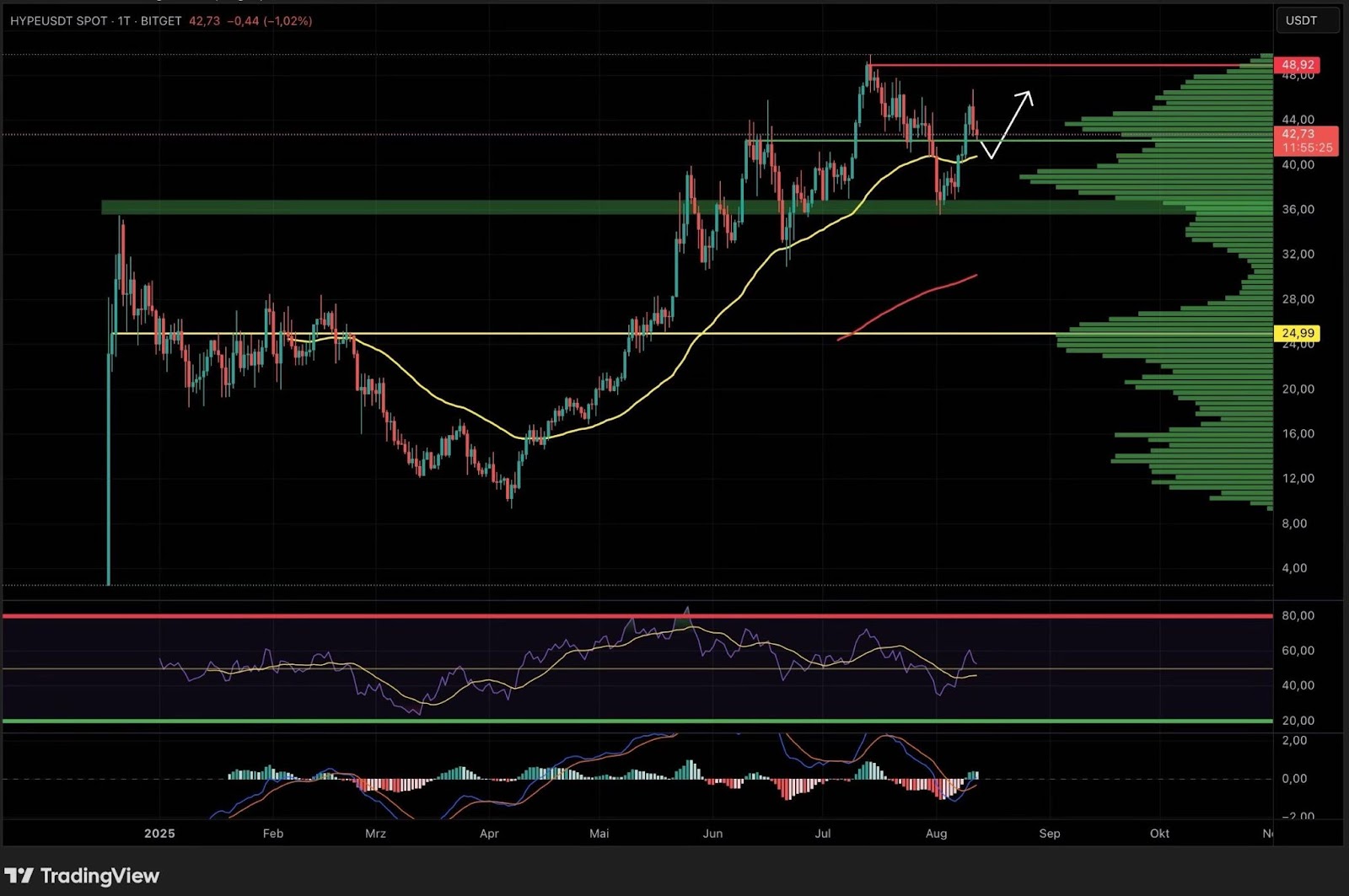 Im Tageschart wird deutlich, dass die kurzfristige Entwicklung von Hype stark mit der Preisbewegung von Bitcoin verknüpft ist. Sollte Bitcoin in eine Korrekturphase übergehen, könnte dies zu spürbarem Abwärtsdruck führen, der Hype zunächst an die grüne Unterstützungszone heranführt. Bei anhaltender Schwäche wäre sogar ein Rücksetzer bis an den 50er EMA möglich, der in dieser Marktphase als zentrale Haltemarke fungieren würde. Eine steigende Bitcoin-Dominanz in Verbindung mit einer Bitcoin-Korrektur würde den Verkaufsdruck auf Altcoins wie Hype zusätzlich verstärken und die Verteidigung des aktuellen Preisniveaus erschweren.