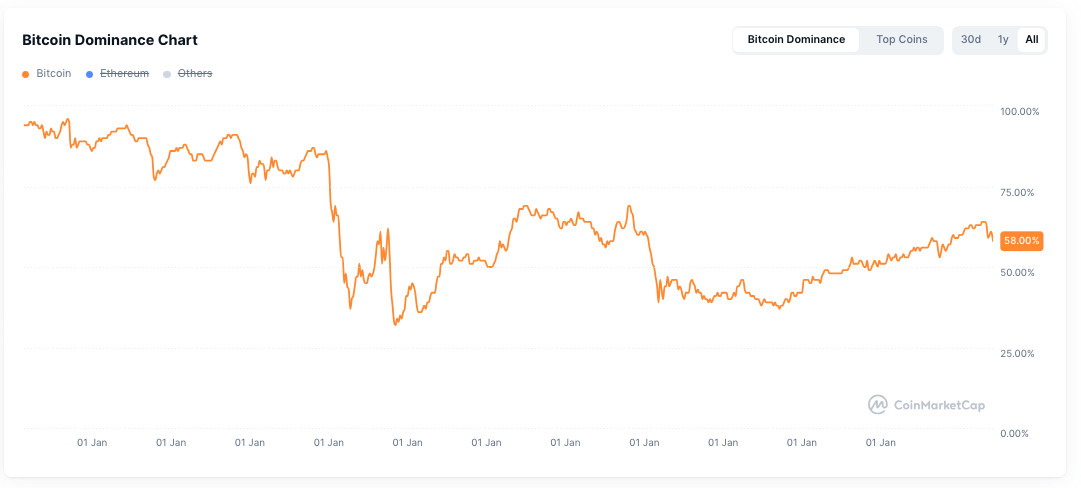 Die Bitcoin-Dominanz sinkt zwar, ist aber noch erhöht | Quelle: Coinmarketcap