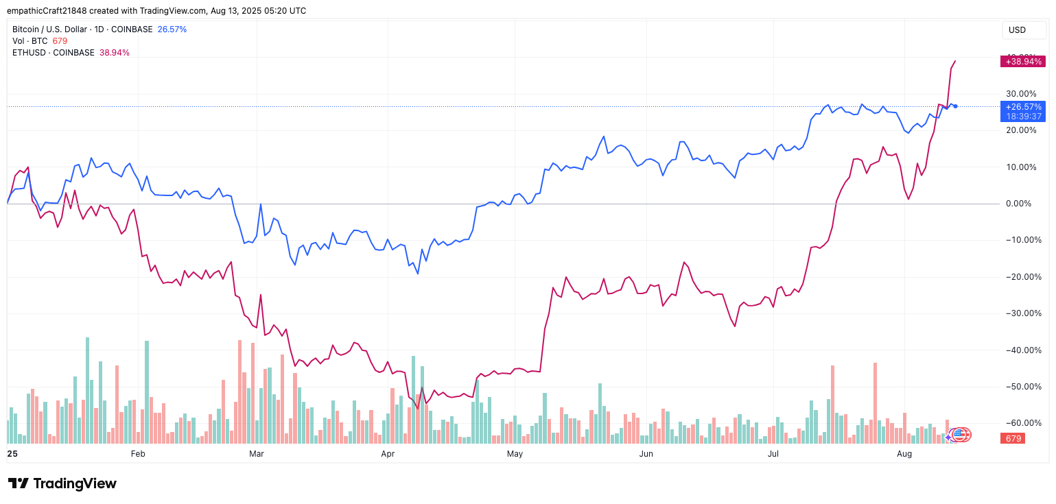Ethereum (rot) beschert seinen Anlegerinnen und Anlegern eine bessere Kursperformance als Bitcoin | Quelle: Tradingview