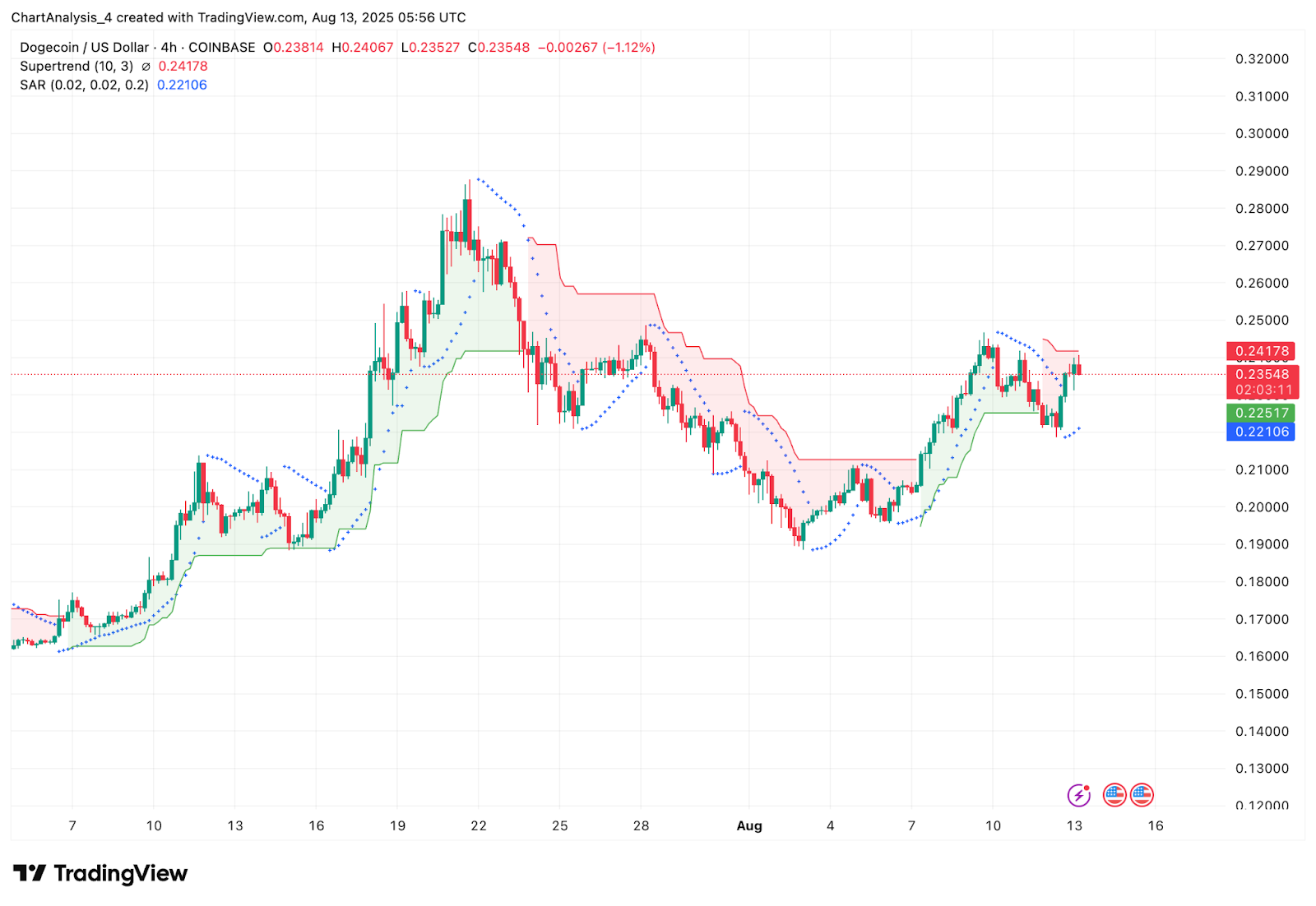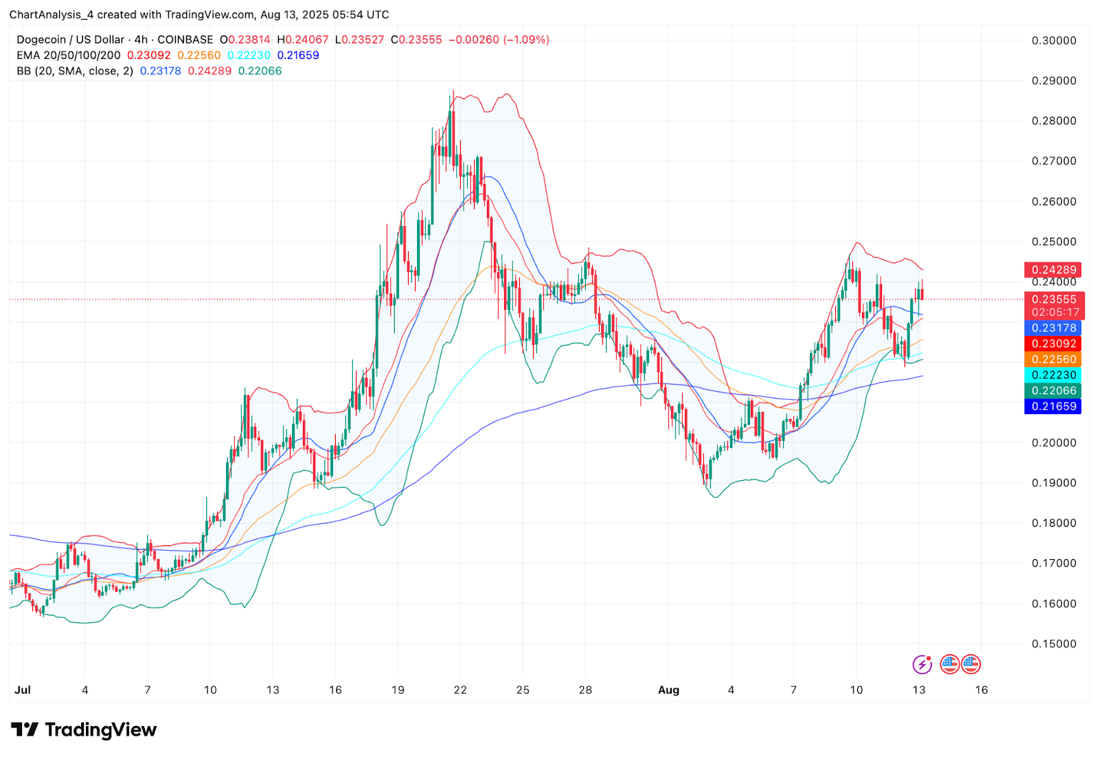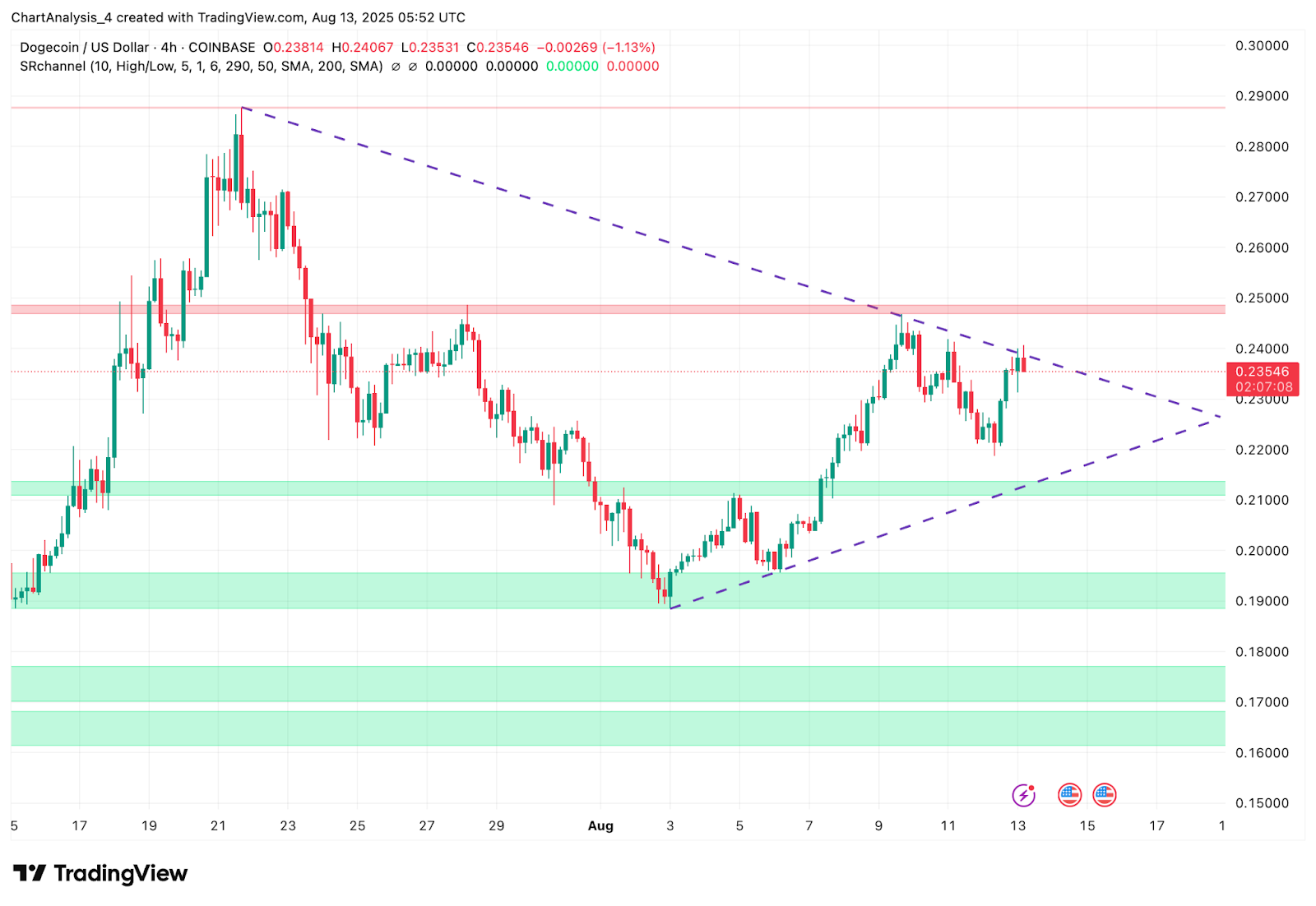 Auf dem 4-Stunden-Chart bleibt die Kursbewegung des Dogecoin innerhalb eines klar definierten symmetrischen Dreiecks, mit einem unmittelbaren Widerstand bei 0,2400 $–0,2428 $ und einer Unterstützung bei 0,2300 $. Die Konsolidierung erfolgt nach einer starken Erholung von 0,2200 $ am 8. August, die mehrere kurzfristige Widerstände überwunden hat.