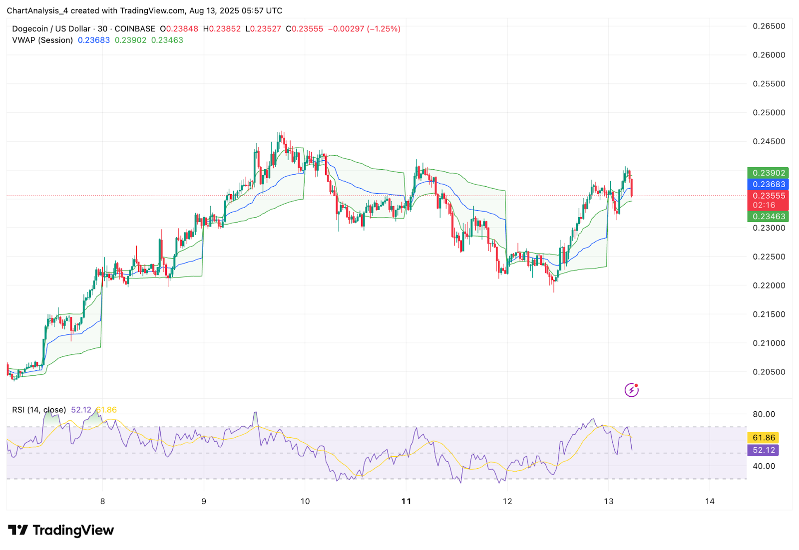 Auf dem 30-Minuten-Chart wird DOGE knapp über dem VWAP bei 0,2368 $ gehandelt, während der RSI bei 52,12 liegt, nachdem er sich von den Intraday-Hochs von 61,86 abgekühlt hat. Dies deutet auf ein neutrales kurzfristiges Momentum hin, das Spielraum für einen Schub lässt, wenn das Volumen steigt.