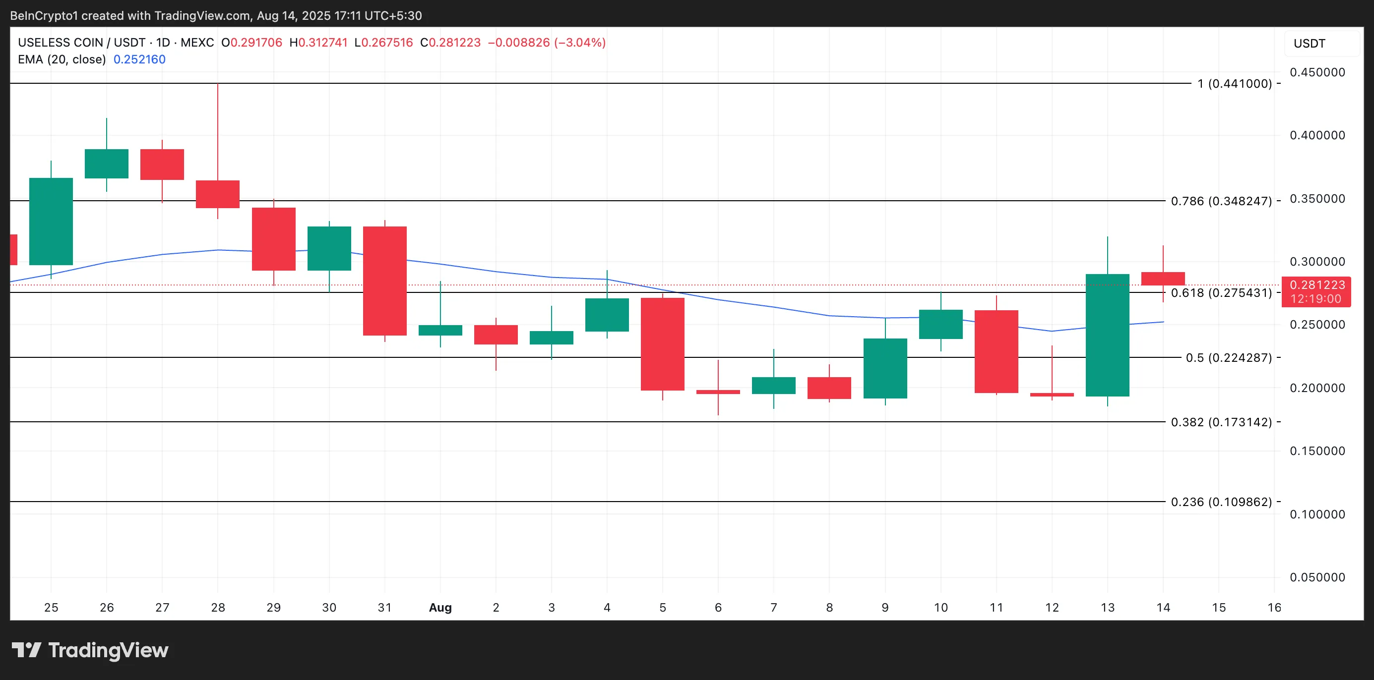 Allerdings, wenn Gewinnmitnahmen einsetzen, könnte der Token unter 0,27 USD fallen und versuchen, Unterstützung bei seinem 20-Tage-EMA zu finden. Wenn dieses Niveau nicht gehalten wird, könnte USELESS weiter in Richtung 0,22 USD zurückfallen.