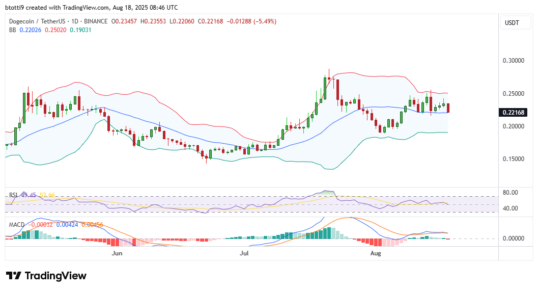 - Der Dogecoin-Preis ist innerhalb von 24 Stunden um 5% gefallen und bewegt sich in der Nähe von 0,22 $.