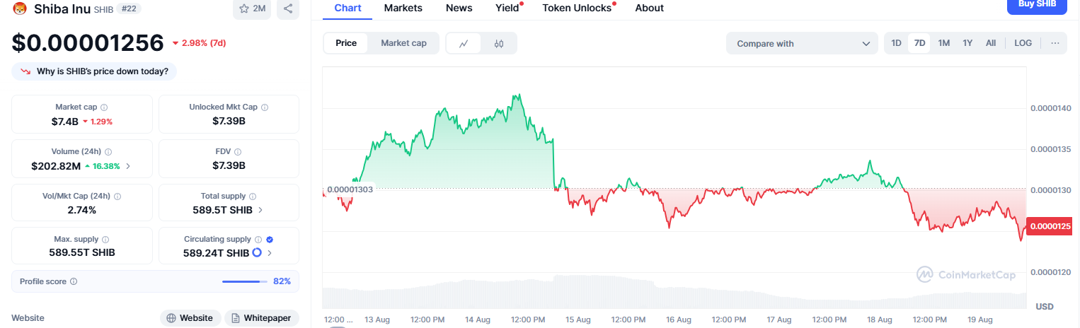 Zum Zeitpunkt der Erstellung dieses Artikels wird SHIB in der Nähe von 0,00001256 $ gehandelt, was einem Rückgang von 1% in den letzten 24 Stunden entspricht. Die Marktkapitalisierung liegt bei 7,40 Mrd. $, während das Tagesvolumen um 101% auf 212 Mio. $ stieg, was ein erhöhtes Handelsinteresse zeigt.