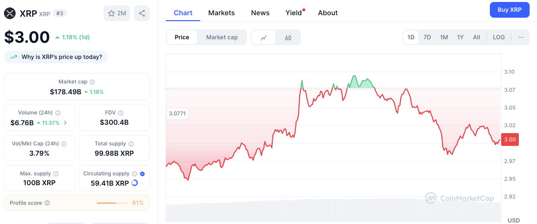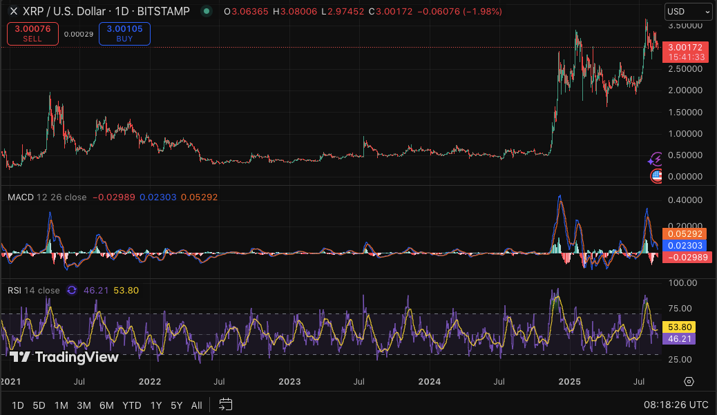 - XRP befindet sich derzeit in einer Konsolidierungsphase und testet das psychologische Niveau von 3,00 $