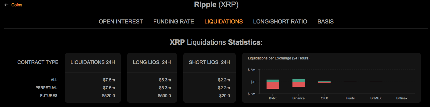 Abgesehen von den Chartsignalen hat die Volatilität von XRP Händler auf beiden Seiten getroffen. In den letzten 24 Stunden haben XRP-Händler 7,5 Millionen US-Dollar an Liquidationen absorbiert. Der Schmerz war vor allem auf der bullischen Seite, wobei 5,3 Mio. $ an Long-Positionen vernichtet wurden, verglichen mit nur 2,2 Mio. $ an Shorts.