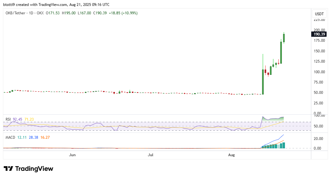 OKB, der native Token der OKX-Börse, ist auf ein neues Allzeithoch von 195 $ gestiegen, wobei Intraday-Gewinne von über 50% den Altcoin auf den neuen ATH katapultierten.